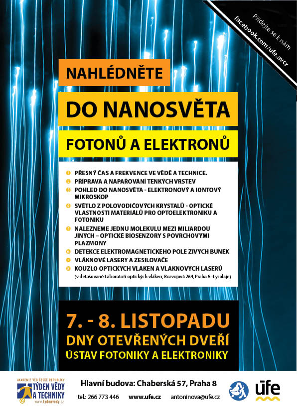 7. a 8. listopadu se již tradičně v našem Ústavu fotoniky a elektroniky konají v rámci Týdne vědy a techniky Dny otevřených dveří. Návštěvníci u nás uvidí nejnovější vědecké postupy i jejich využití v praxi. Otevřena bude jak hlavní budova na Praze 8, tak detašovaná laboratoř v Lysolajích.
