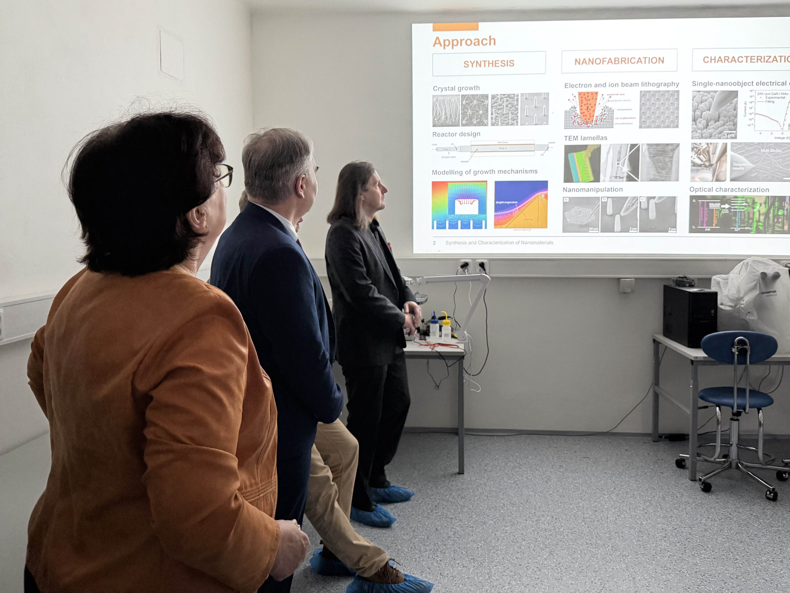 The program included a tour of selected ÚFE laboratories in the Kobylisy building, during which the President of the CAS was introduced to specific research topics, long-term projects, and their practical impacts.
