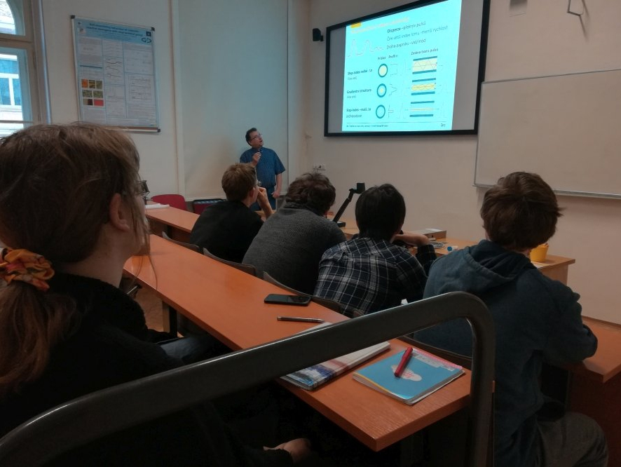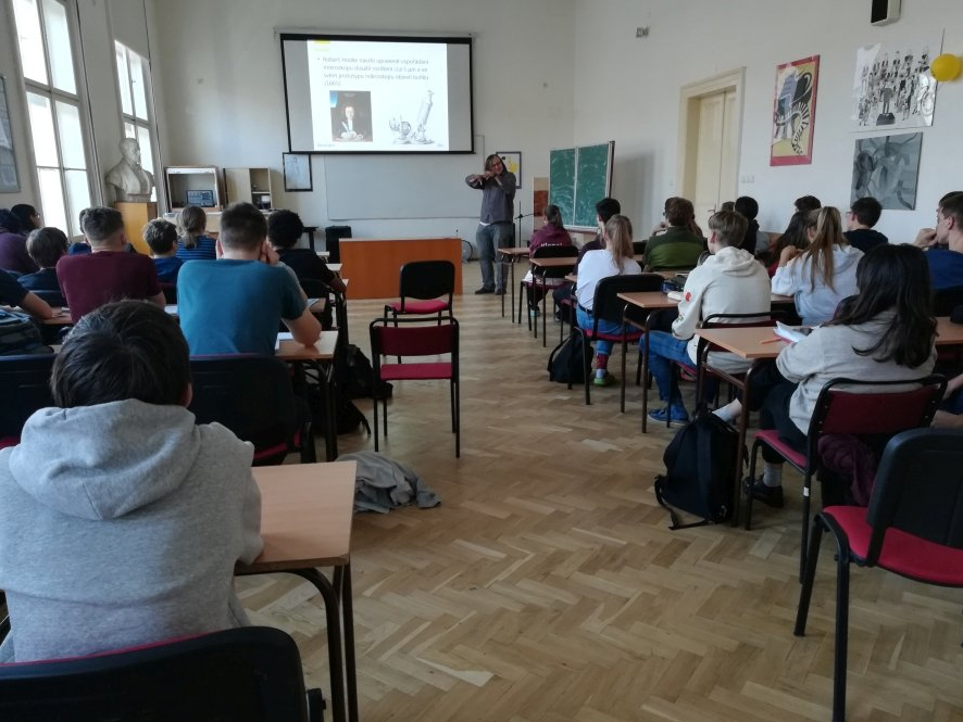 Marek Piliarik from Nano-optics research team a Jan Mrázek with Ivan Kašík from Fiber lasers and non-linear optics research team accepted the invitation of Prof. Dagmar Švarcová from Christian Doppler Grammar School and attended Days of Science, days of expert lectures for students of grammar school, which took place on December 4 in the main building in Zborovská street in Prague 5.
