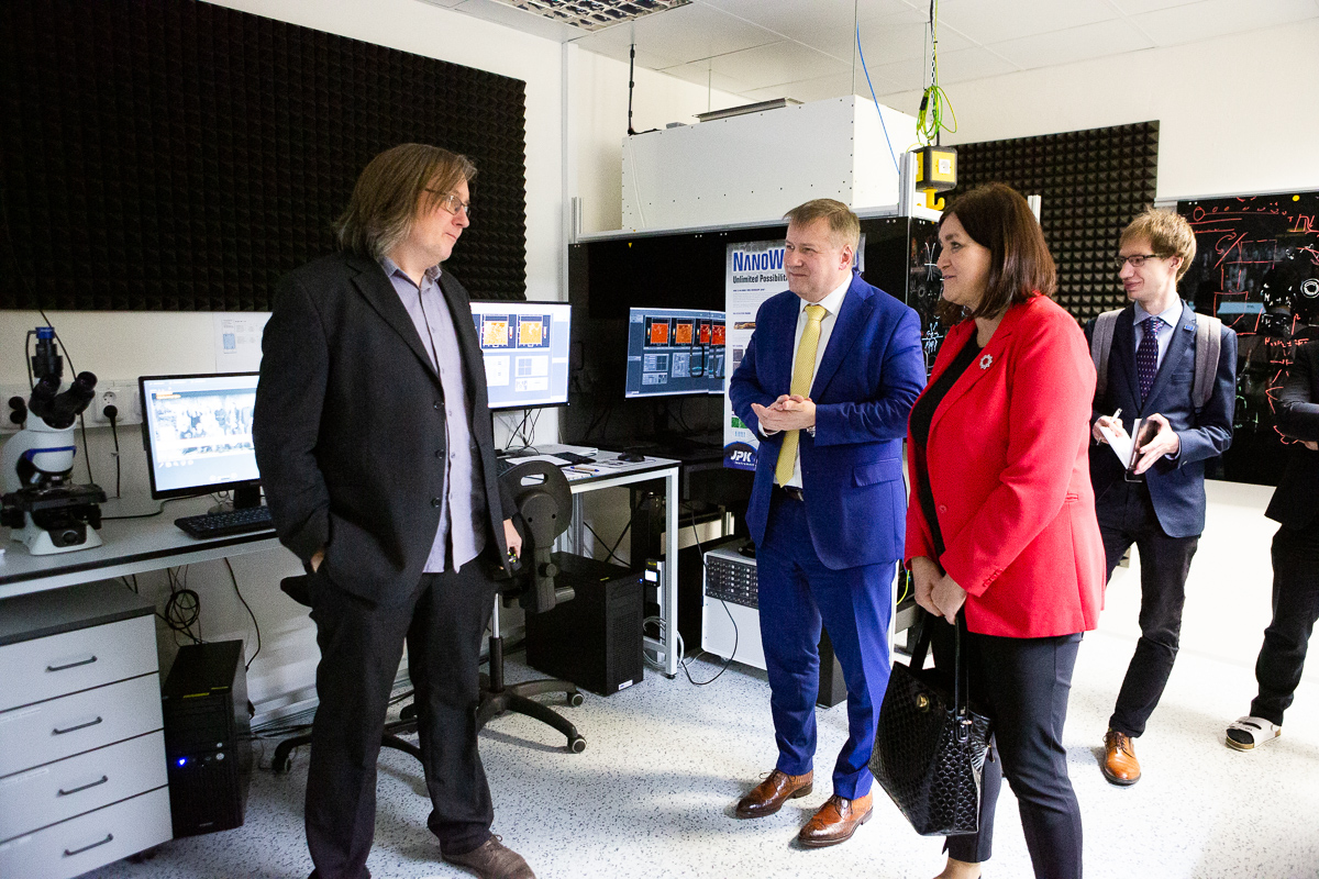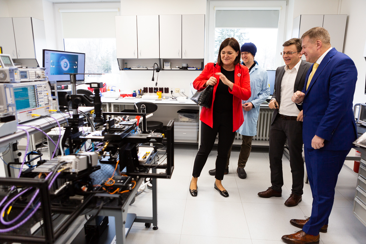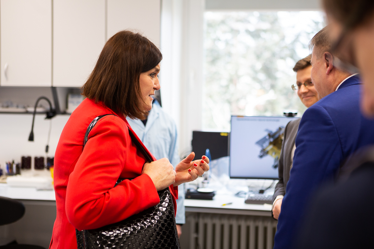 The minister’s first steps led her to the Bioelectrodynamics research team, where Michal Cifra presented research into the interaction of electromagnetic fields with organisms at the cellular and molecular level for new approaches in nanotechnology and biomedical diagnostics and therapy. Together with his colleague Daniel Havelka, they also presented a new piece of equipment – a subterahertz station for testing microfluidic chips. In the Fiber Lasers and Non-linear Optics Laboratory, the Minister was interested in the use of lasers and optical fibers in industry. She listened with interest to information about the TALOS project funded by the European Defense Agency, focused on a new generation of air defense, for which ÚFE has developed an active optical fiber and is coordinating work on a high-power fiber laser. She then visited the Nano Optics team’s laboratory, which recently received an award from the Academy of Sciences for its outstanding results in research, experimental development, and innovation. Marek Pilliarik pointed out the successful synergy between basic research and technology transfer to the industrial sector and the training of highly qualified experts. Jiří Homola and Markéta Bocková presented their research on Optical Biosensors with surface plasmons to the minister and discussed with her the possibilities of applying biosensors in medicine, especially in the diagnosis of neurodegenerative and tumor diseases.