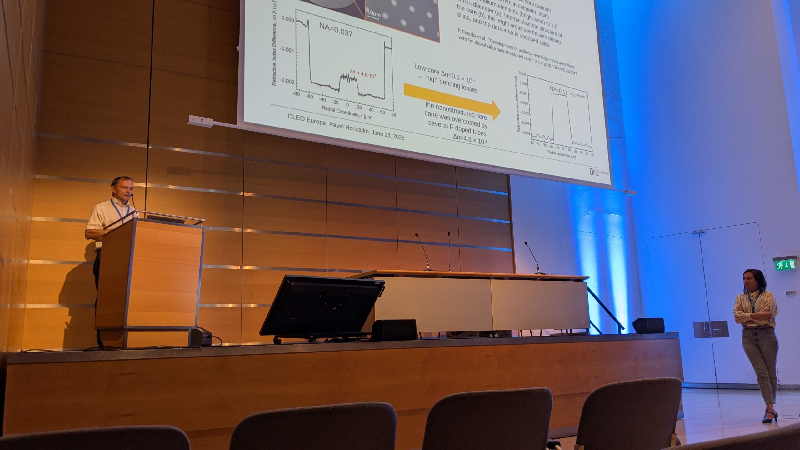 ÚFE presented record-breaking fiber laser results at the concurrent CLEO-Europe congress. Pavel Honzátko gave an invited talk at the CLEO-Europe congress on our fiber optics for 2-micron fiber lasers, including all-fiber thulium lasers in the >100 W class with the highest differential efficiencies at the time. Jan Pokorný presented a holmium fiber laser at 2.1 micron wavelength with the highest output power and highest efficiency ever demonstrated in a core-pumped configuration. Bára Švejkarová was involved in another record-breaking experiment: at the Optoelectronic Research Centre at the University of Southampton, they broke the limits of thulium-doped fibres with a standard outer diameter of 125 microns and obtained an output power of 272 W thanks to the structured fiber core.