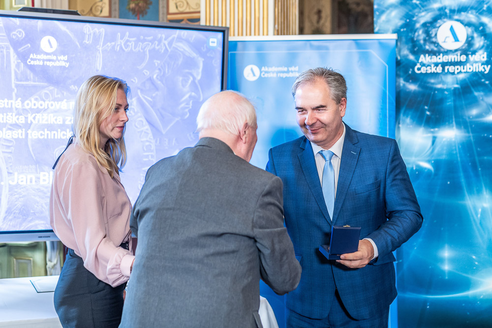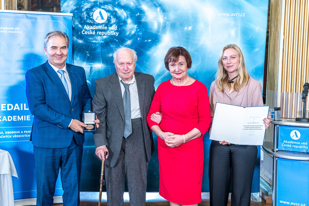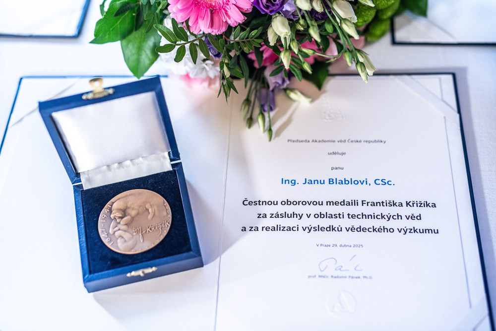 Ing. Jan Blabla, CSc., který je s naším ústavem spojen již od jeho samotného začátku – nastoupil k nám 1.10.1954, tedy úplně první den fungování ústavu, převzal medaili Františka Křižíka. Medaile je oceněním za zásluhy v oblasti technických věd a za realizaci výsledků vědeckého výzkumu. Jan Blabla proslul především svým přínosem k využití laserů v praxi, o čemž pojednává také dokumentární film První laserová operace oka v Československu a některé články v časopise JMO (Jemná mechanika a optika) k 60. výročí a 70. výročí našeho ústavu.