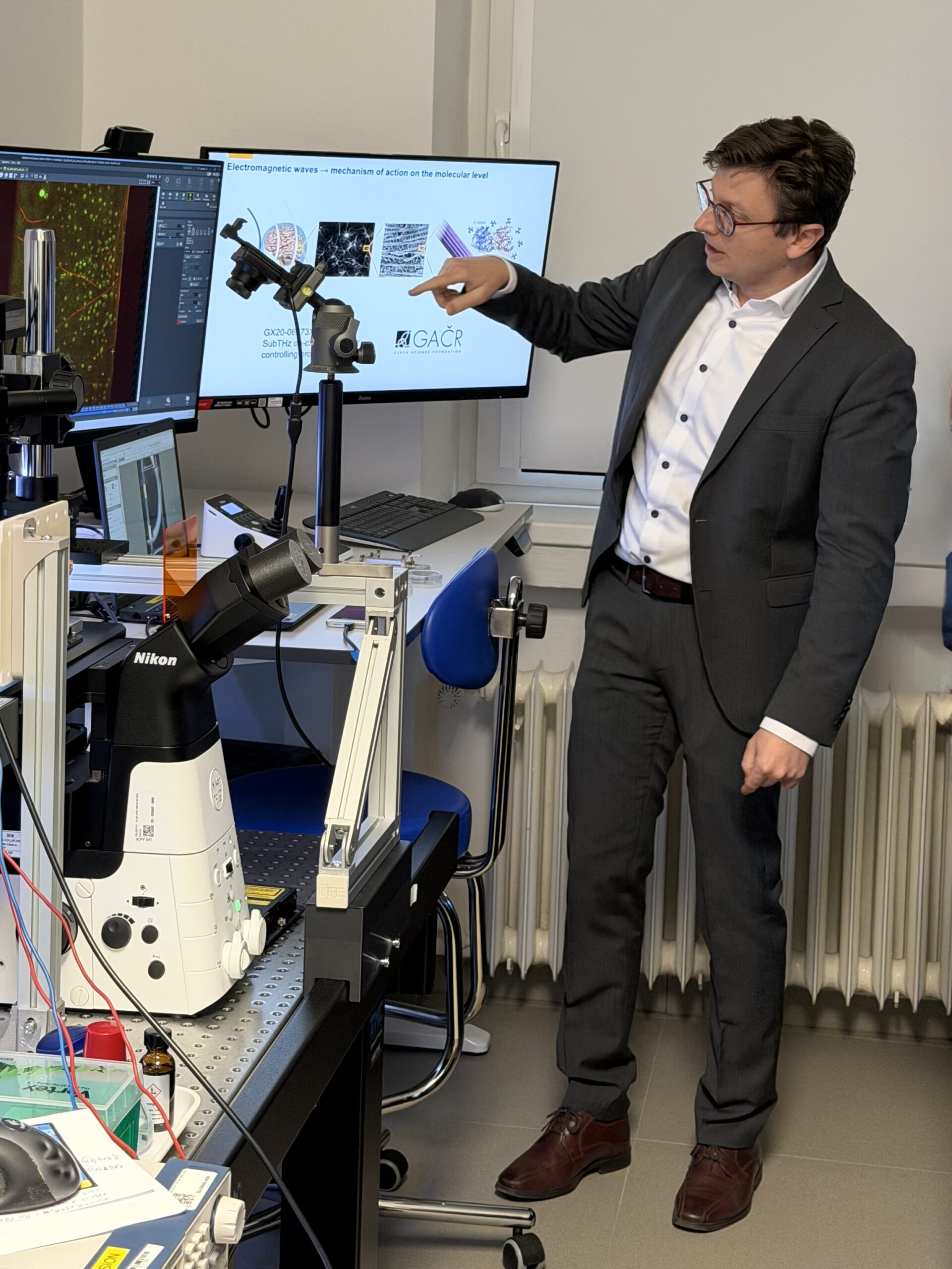 V laboratoři Bioelektrodynamiky zaujala mimo jiné informace Michala Cifry o odborné besedě v Poslanecké sněmovně, kde byly prezentovány poznatky týkající se působení elektromagnetických polí a sítí 5G na lidský organismus, a to v širším kontextu společenské relevance výzkumu realizovaného na ÚFE.