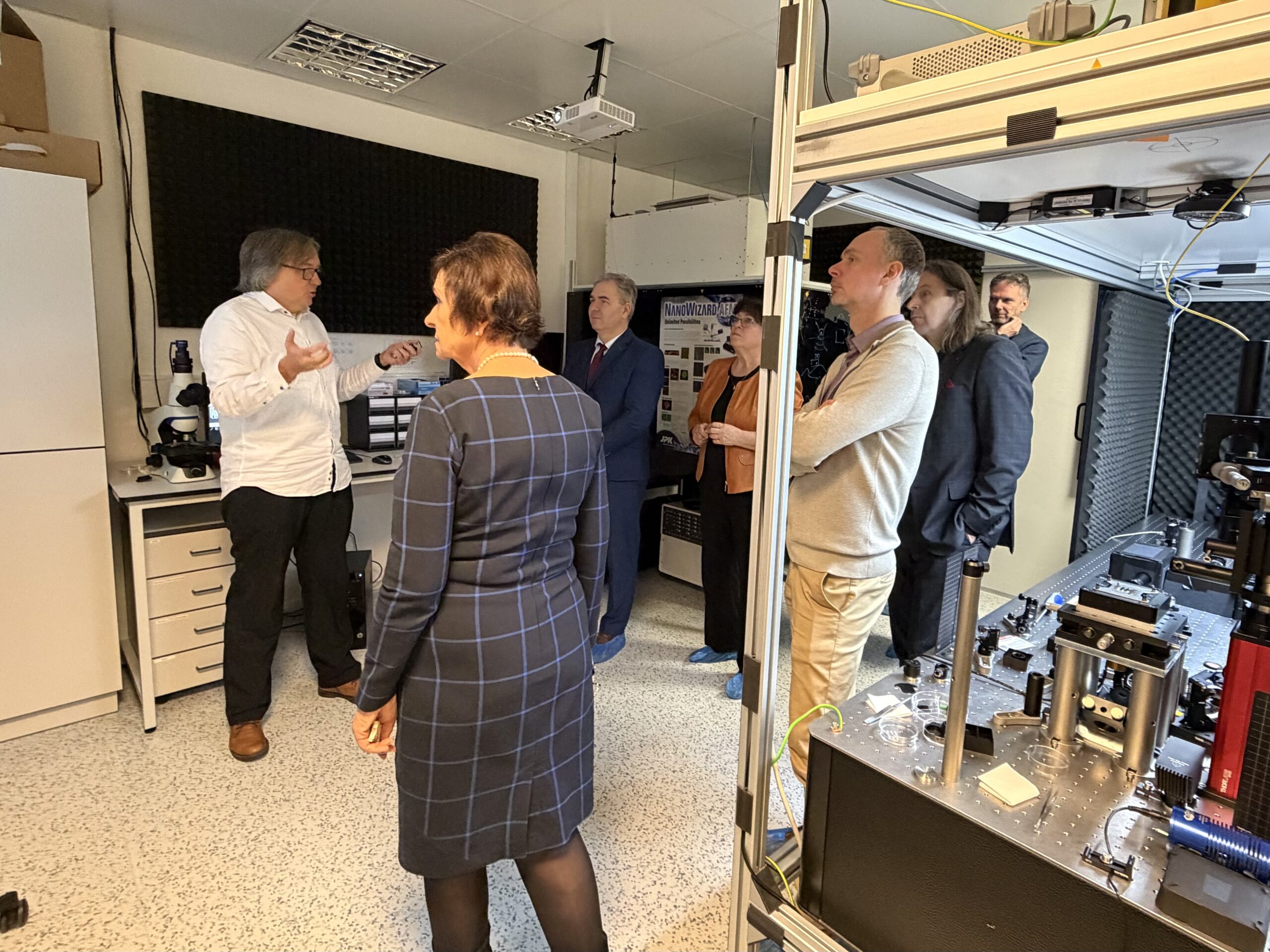 Laboratořemi Optických biosenzorů provázeli prof. Jiří Homola a Markéta Bocková, kteří představili vědecky nejúspěšnější tým ÚFE. Prezentovaný výzkum biosenzorů nachází významné uplatnění v medicíně, například při rozpoznávání neurodegenerativních onemocnění, jako je Alzheimerova choroba, a je realizován v rámci řady národních i mezinárodních projektů.