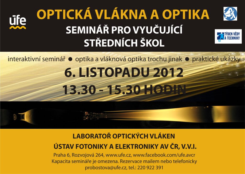 V úterý 6. 11. od 13.30 hodin pořádá naše laboratoř optických vláken seminář pro učitele středních a středních odborných škol na téma Optická vlákna a optika.