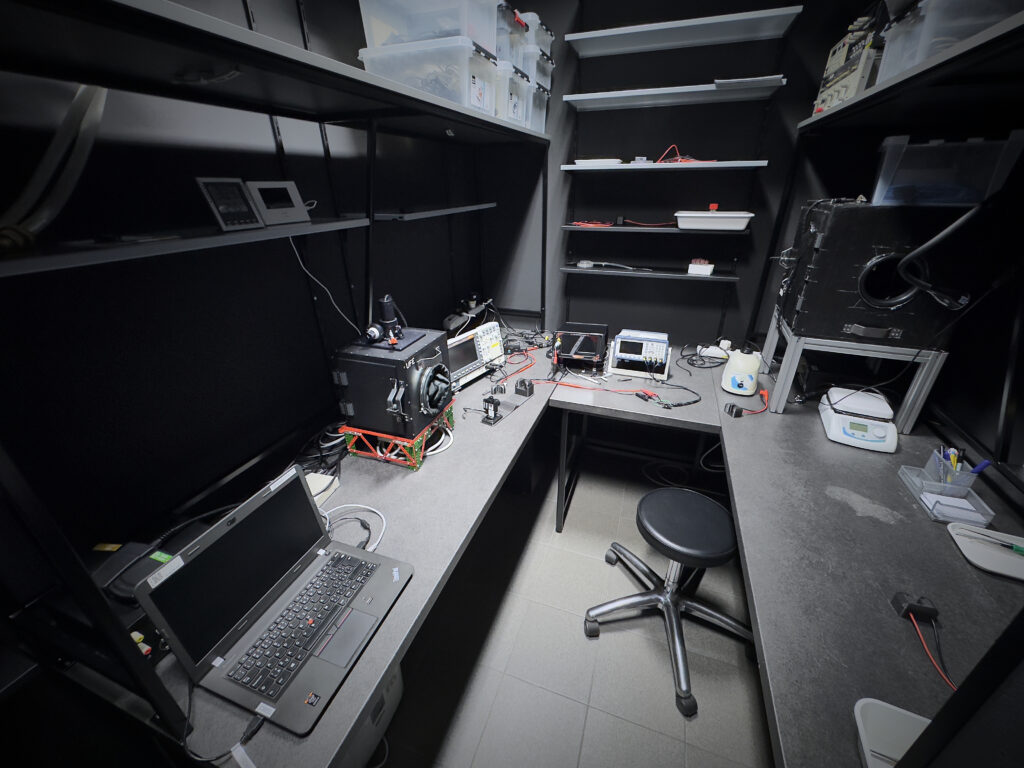 Experimentální systémy a vyhrazená temná místnost pro měření ultranízké intenzity světla a fotonické experimenty.