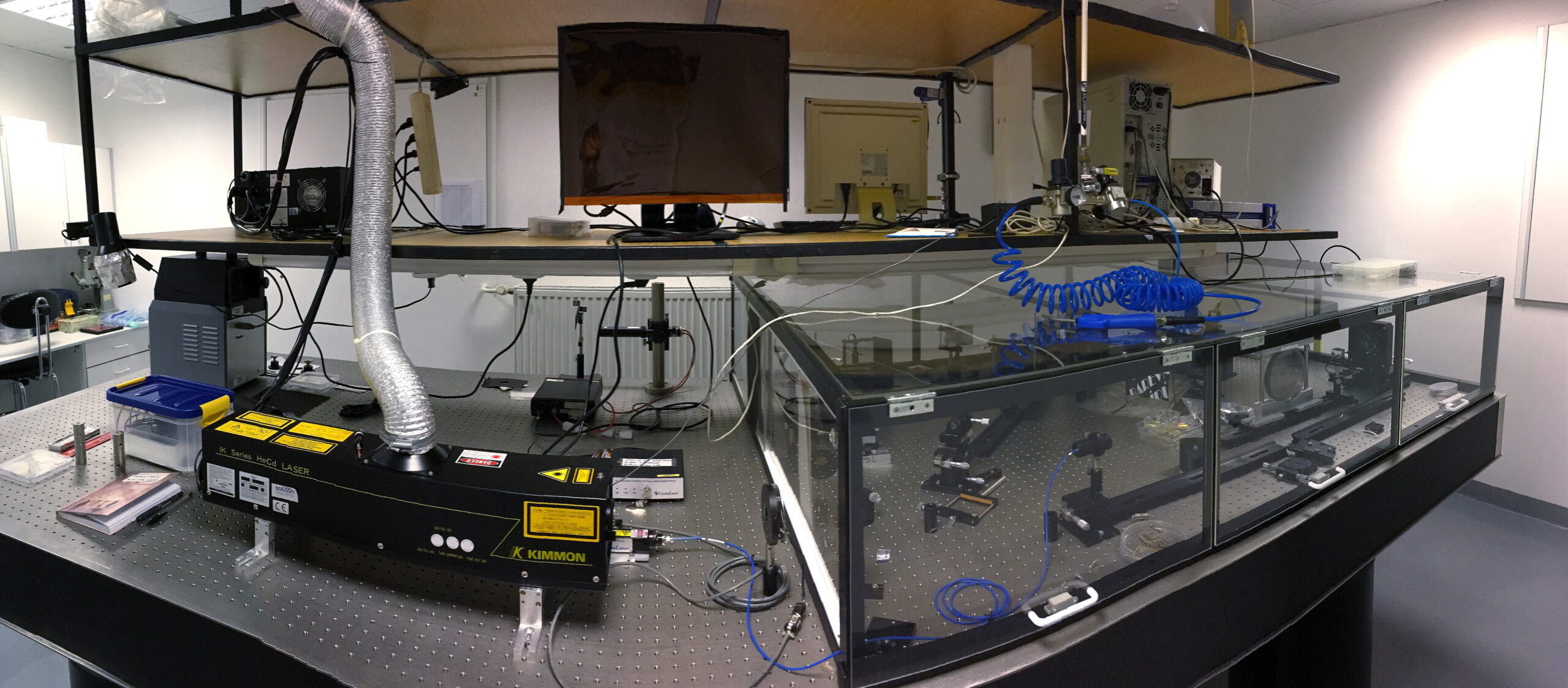 - sestava pro holografii: helium-kadmiový laser, vlnová délka 325 nm (model IK3031R-C, Kimmon Koha), pevnolátkový laser, 405 nm (CrystalLaser), děliče svazku, zrcadla